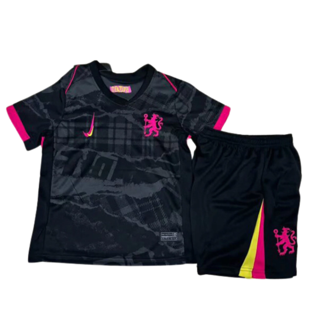 O kit inclui uma camisa oficial e um calção esportivo, ambos fabricados com tecidos leves e respiráveis para garantir conforto durante a prática esportiva.